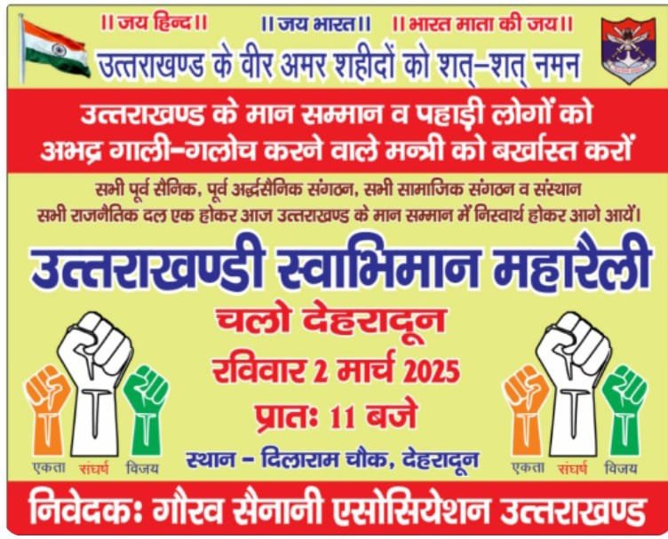 आप सभी सम्मानित जनता जनार्दन सभी गौरव सेनानियों,सभी पूर्व सैनिक पूर्व अर्धसैनिक संगठन,सभी सामाजिक संस्थाओं,बात आज अपने उत्तराखंड के स्वाभिमान की है बात अपने पहाड़ के लोगों की है जो भी उत्तराखंड में रह रहे सभी की ।? एक मंत्री बार बार गलती करता है उत्तराखंड व पहाड़ी लोगों को अमर्यादित भाषा का प्रयोग करता है और सरकार नेता मंत्री जिनको उत्तराखंड के लोगों ने विधानसभा भेजा है वो इस मंत्री पर कार्यवाही की माँग को छोड़कर उसका बचाव कर रहे जो कि शर्मनाक है ।लेकिन आज उत्तराखंड में ही नहीं सभी प्रदेश के प्रवासी भी आंदोलन कर रहें है हमें इनसे सीखना चाहिए अब यह आंदोलन रूकना नहीं चाहिए ।