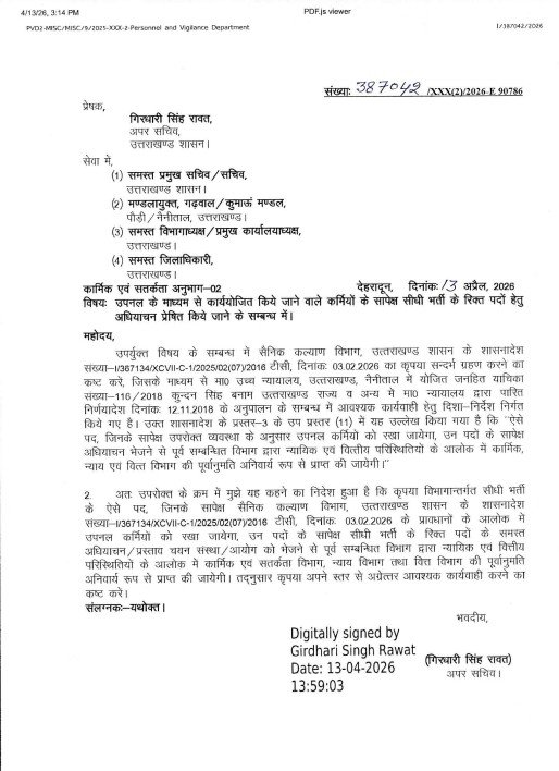 कार्मिक विभाग के निर्देश के अनुसार, जिन पदों पर उपनल कर्मी कार्यरत हैं और जिन्हें सीधी भर्ती से भरा जाना है, उन पर अब सीधे अधियाचन नहीं भेजा जा सकेगा।