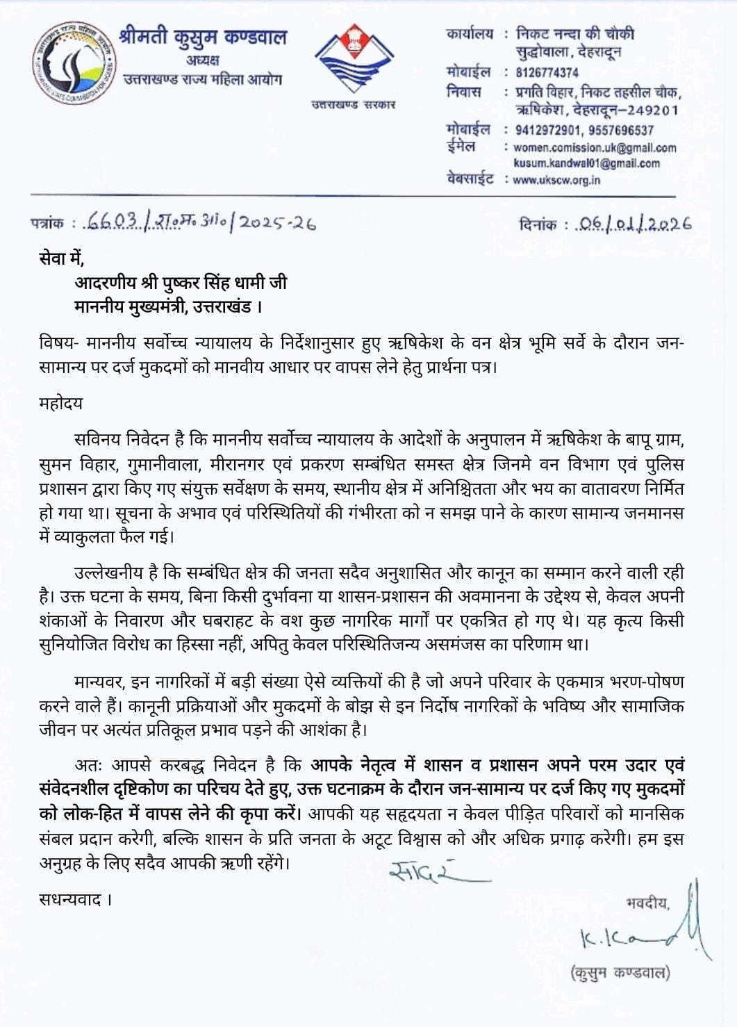 महिला आयोग की अध्यक्ष कुसुम कंडवाल ने मुख्यमंत्री से अपेक्षा जताई कि सरकार इस पूरे प्रकरण को संवेदनशीलता और मानवीय दृष्टिकोण से देखेगी। उन्होंने कहा कि यदि निर्दोष नागरिकों पर दर्ज मुकदमे वापस लिए जाते हैं, तो इससे न केवल प्रभावित परिवारों को मानसिक संबल मिलेगा, बल्कि शासन और जनता के बीच विश्वास भी और मजबूत होगा।