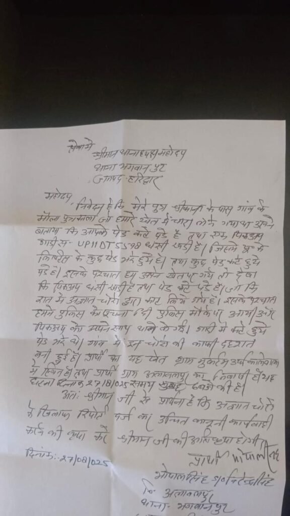 ग्राम मुकर्दम अर्थ कालवाका में बीती रात अज्ञात चोरों ने कई पेड़ों को काटकर पिकअप गाड़ी में भर लिया। घटना का खुलासा तब हुआ जब खेत मालिक श्रीकांत पुत्र भोपाल सिंह साध के खेत में चारा लेने पहुंचे मौला पुत्र काला ने सुबह देखा कि खेत में पेड़ कटे पड़े हैं और एक पिकअप गाड़ी (UPIIDT 5598) धंसी खड़ी है।