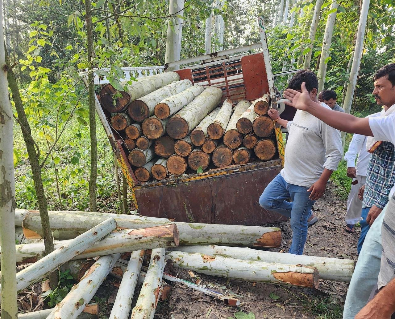 गाड़ी के अंदर लगभग 50 पेड़ों की लकड़ियाँ भरी हुई थीं, जबकि कुछ पेड़ खेत में ही कटे पड़े मिले। ग्रामीणों ने तुरंत खेत मालिक को सूचना दी।