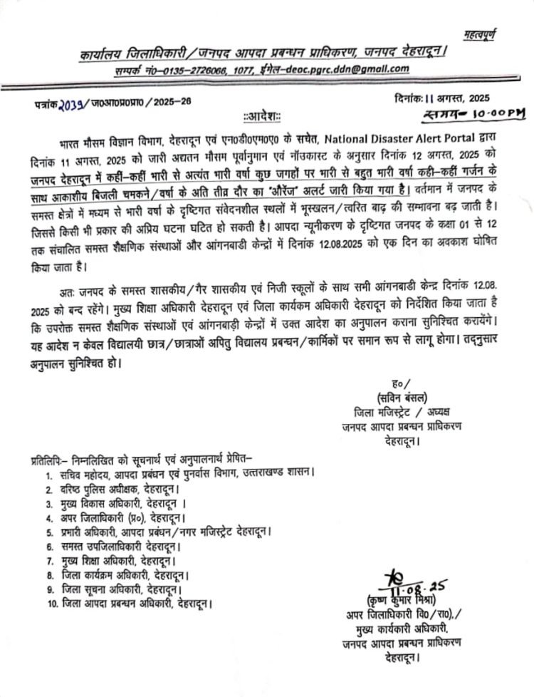 देहरादून, 11 अगस्त 2025 — जिले में मौसम विभाग और राष्ट्रीय आपदा प्रबंधन प्राधिकरण (NDMA) की चेतावनी के बाद जिला प्रशासन ने मंगलवार, 12 अगस्त 2025 को सभी स्कूलों और आंगनबाड़ी केंद्रों में एक दिन का अवकाश घोषित कर दिया है। आदेश के मुताबिक, कक्षा 1 से 12 तक के सभी सरकारी, गैर-सरकारी और निजी स्कूल बंद रहेंगे।