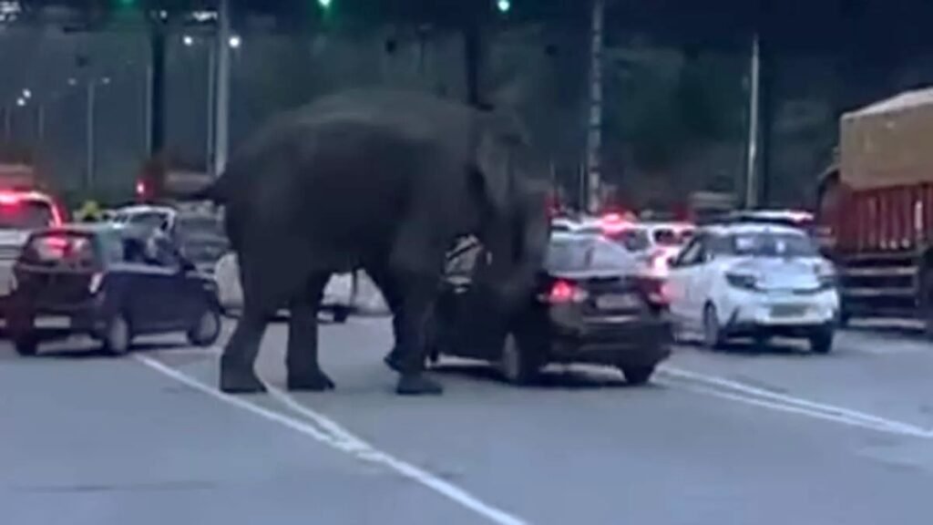 • इस दौरान, कतार में खड़ी एक कार ने हाथी के सामने से तेज़ी से निकलने की कोशिश की।
