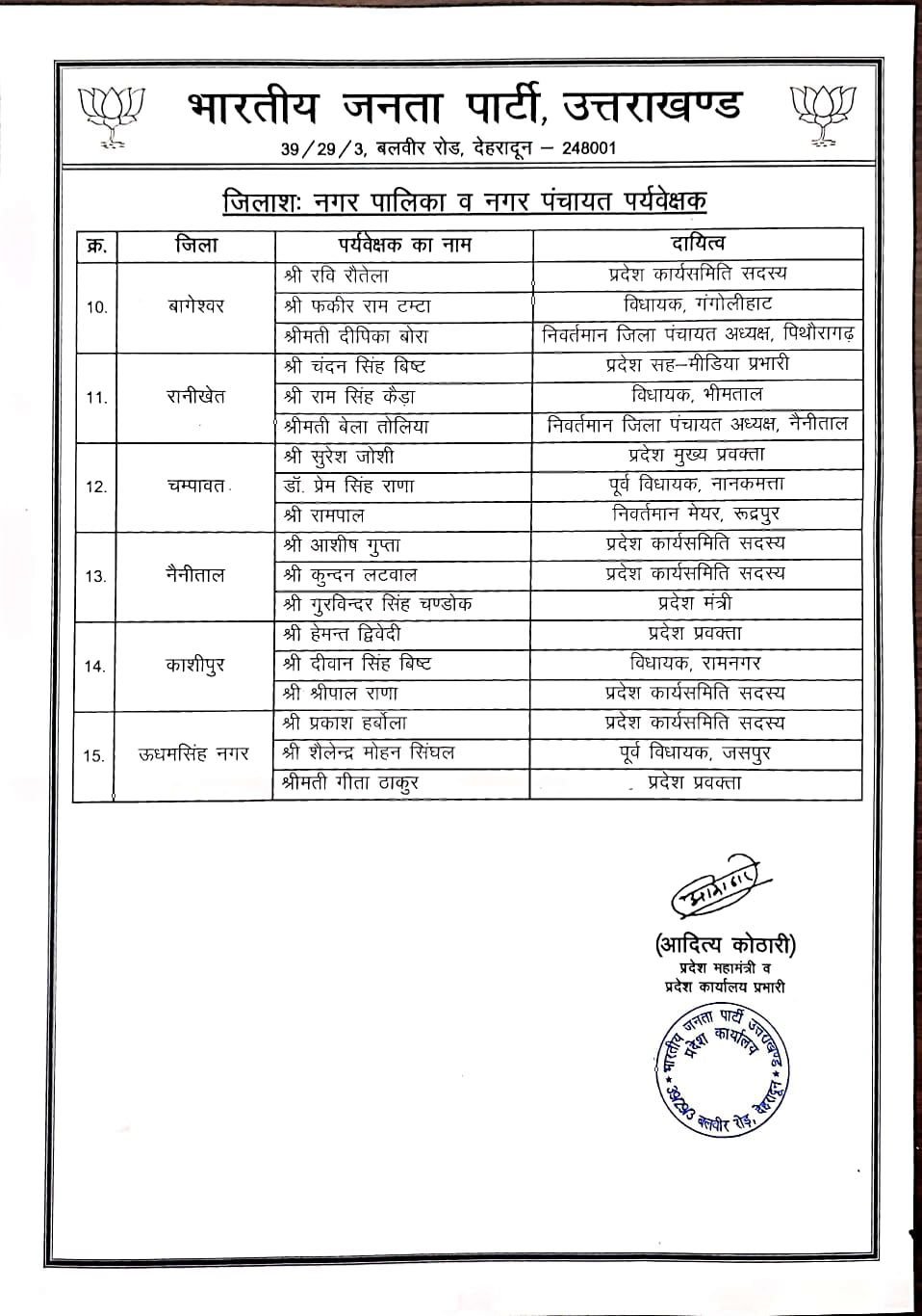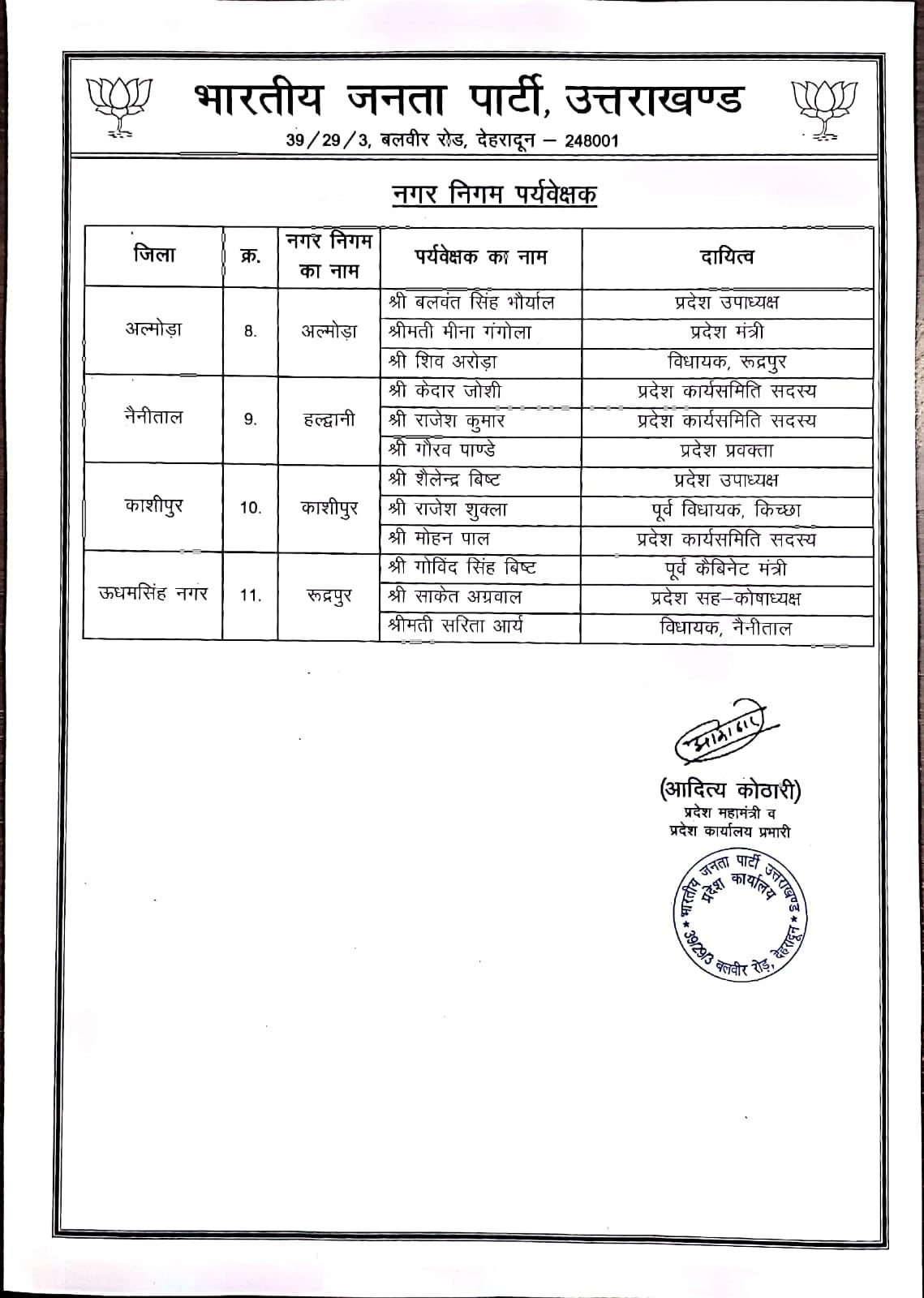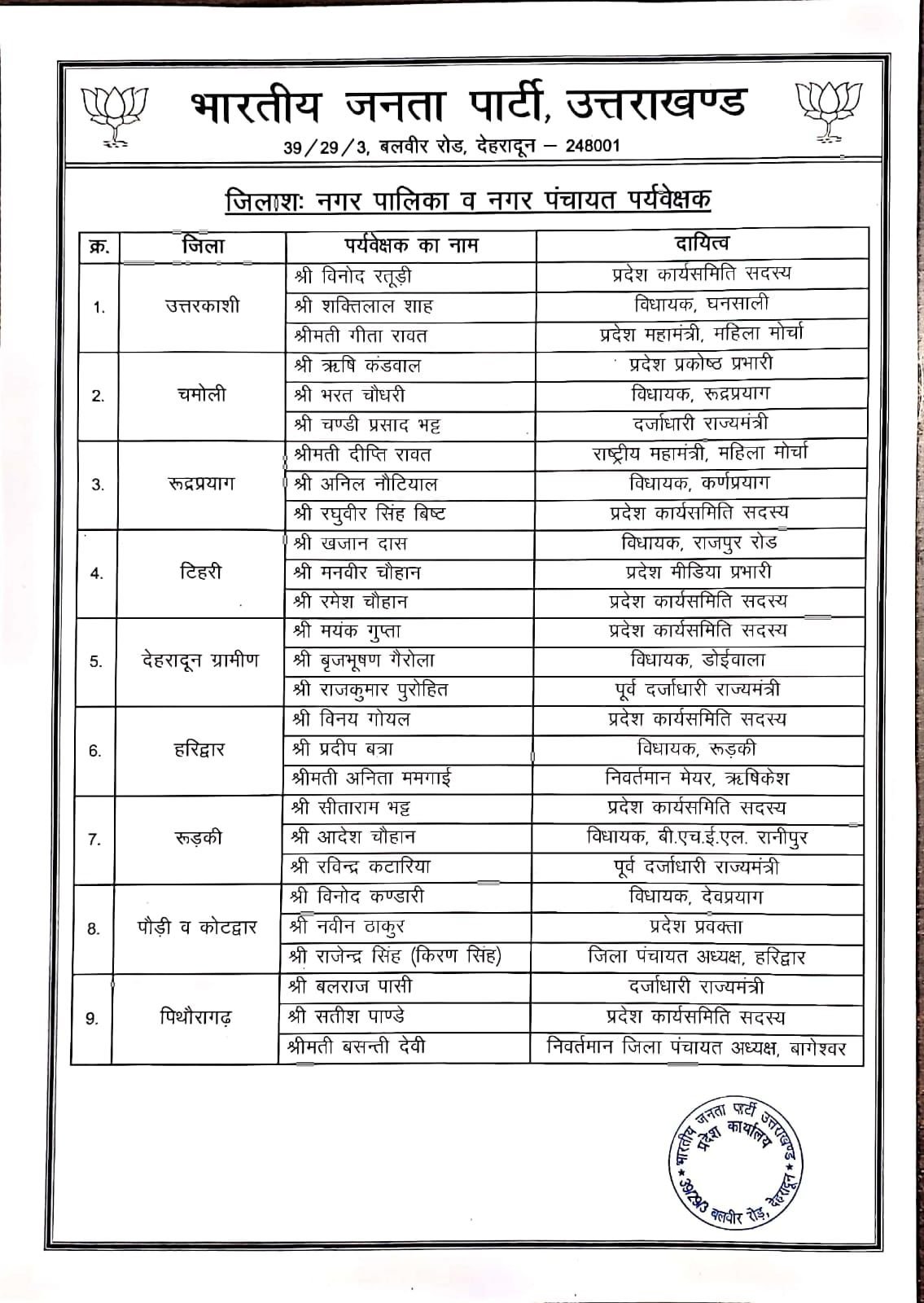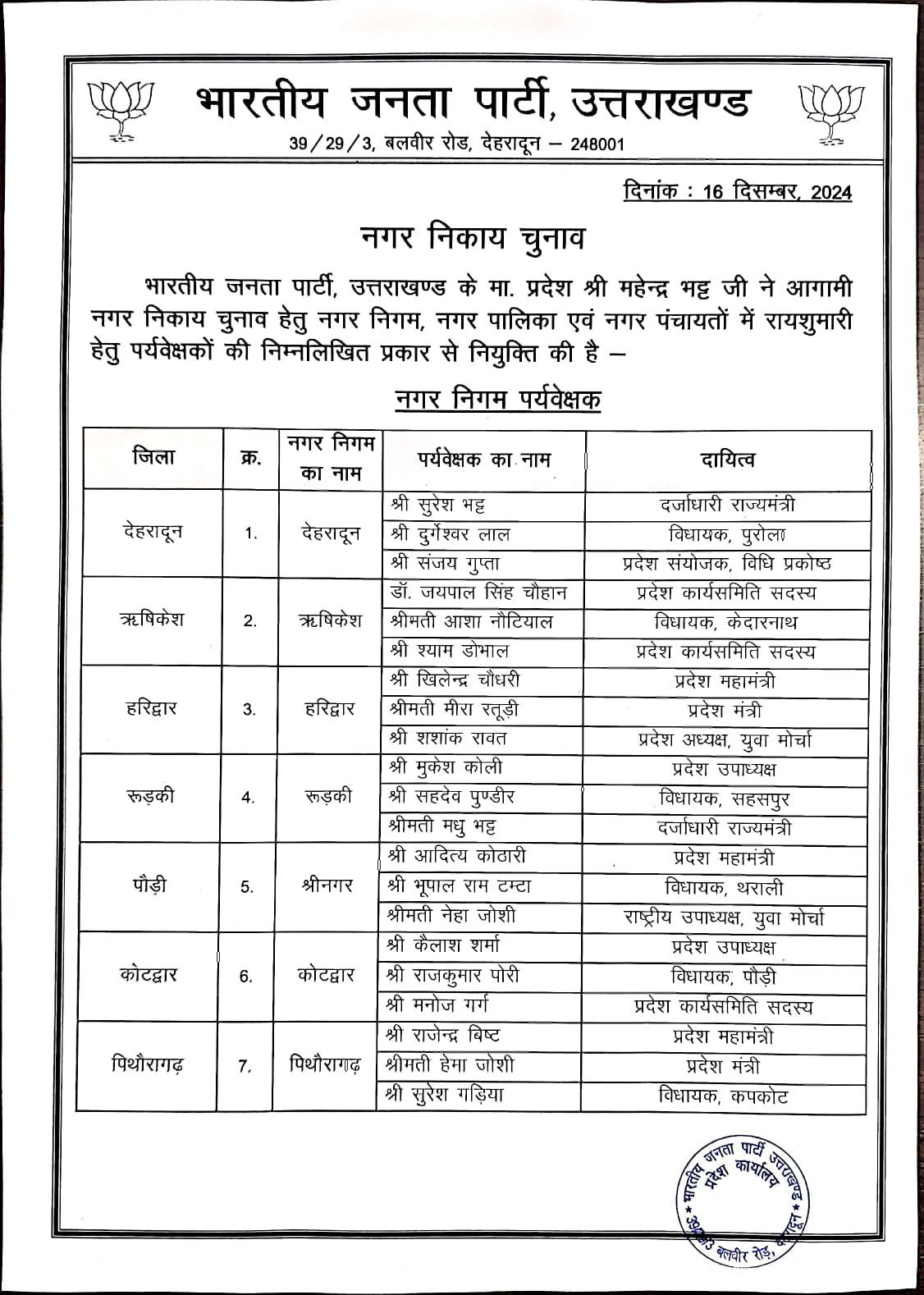 भाजपा ने निकाय चुनाव के लिए पर्यवेक्षक नियुक्त कर दिये हैं। पार्टी की ओर से इसकी सूची जारी कर दी गयी है।