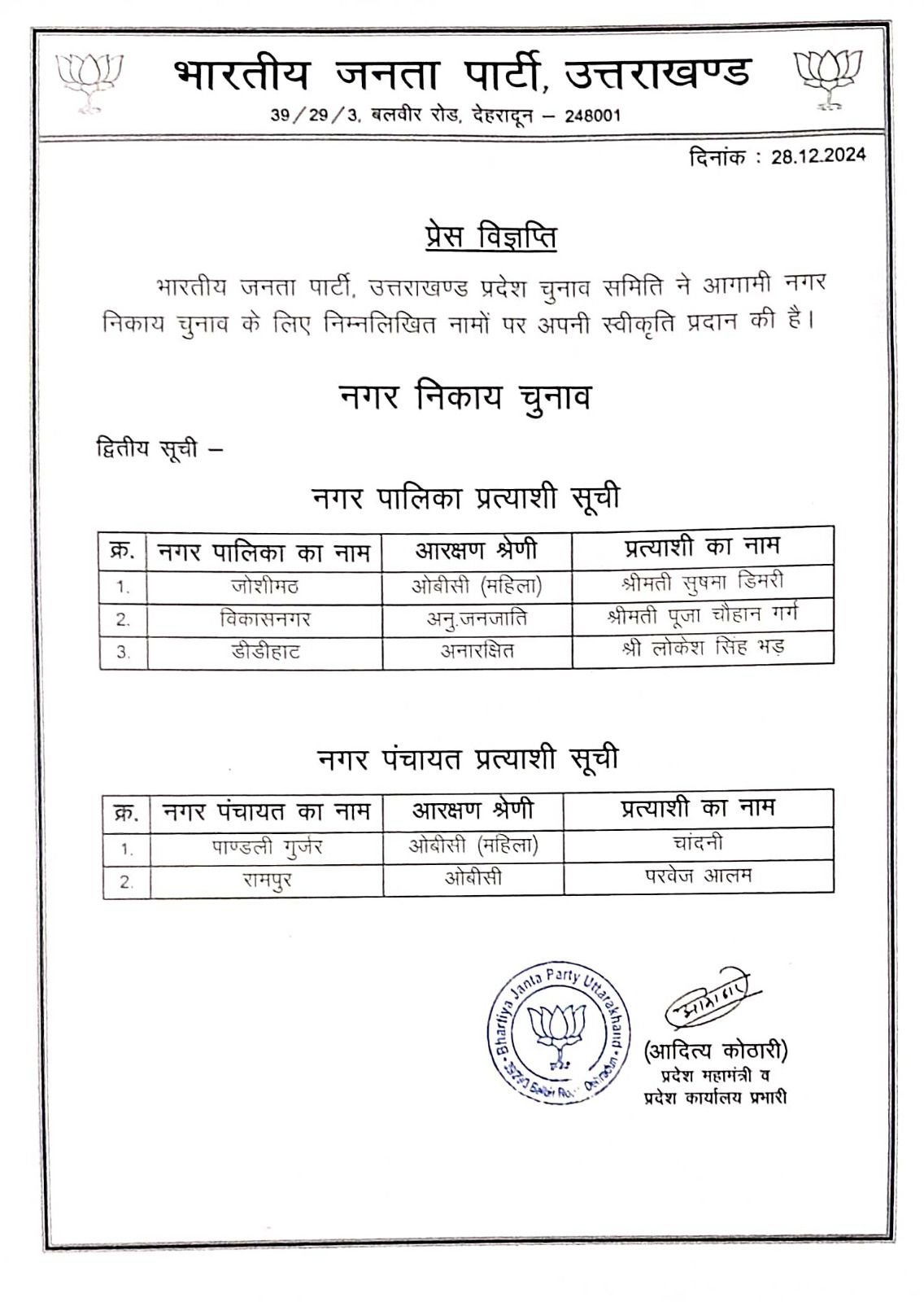 भाजपा ने जनपद पौड़ी और रानीखेत जिले मे 2 कार्यकारी जिलाध्यक्ष नियुक्त किये हैं।