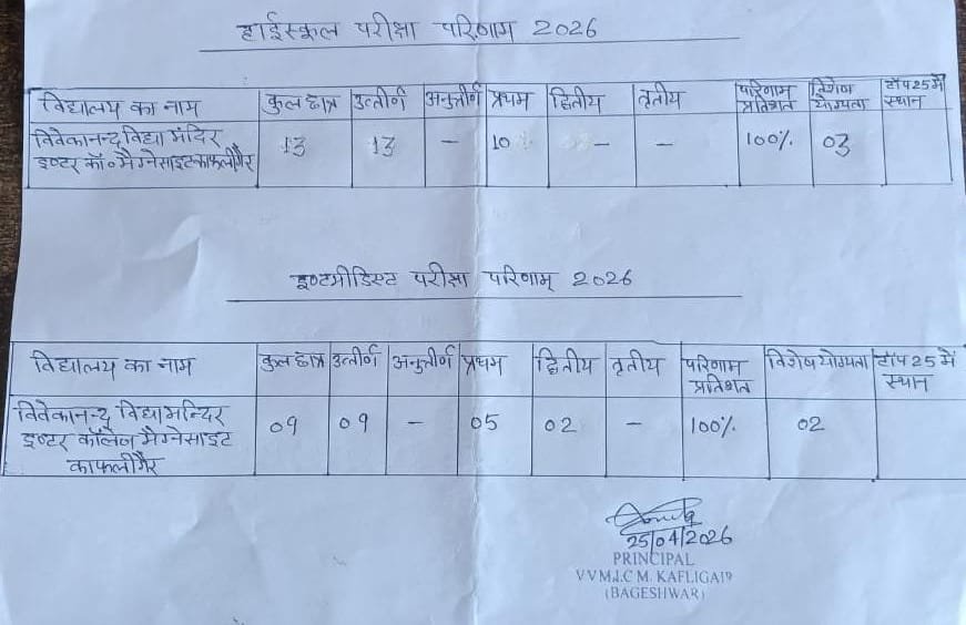 गत वर्षों की परंपरा को कायम रखते हुए इस वर्ष भी विवेकानंद विद्या मंदिर इंटर कॉलेज, काफलीगैर (बागेश्वर) ने बोर्ड परीक्षाओं में शत-प्रतिशत परिणाम हासिल किया है। विद्यालय के सभी छात्र-छात्राओं के उत्तीर्ण होने से क्षेत्र में खुशी का माहौल है।
