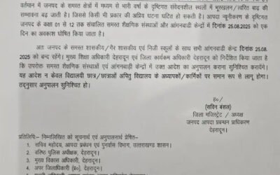 Breaking News भारत मौसम विज्ञान विभाग (IMD) देहरादून और राष्ट्रीय आपदा प्रबंधन प्राधिकरण (NDMA) ने सोमवार, 25 अगस्त 2025 को देहरादून जनपद के लिए ऑरेंज अलर्ट जारी किया है। मौसम अपडेट प्रशासनिक आदेश Advisory for Public स्थिति पर नजर देहरादून में लगातार हो रही वर्षा से जनजीवन प्रभावित हो सकता है। प्रशासन ने लोगों से…