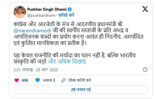 उत्तराखंड के मुख्यमंत्री पुष्कर सिंह धामी ने भी इस घटना की कड़ी निंदा की। उन्होंने कहा कि पीएम मोदी की माता के लिए अभद्र भाषा का इस्तेमाल करना सिर्फ मोदी का नहीं, बल्कि पूरे देश का अपमान है। धामी ने कहा कि यह ऐसा अपराध है कि राहुल गांधी और तेजस्वी यादव हजार बार भी माफी मांगें तो भी जनता उन्हें कभी माफ नहीं करेगी।